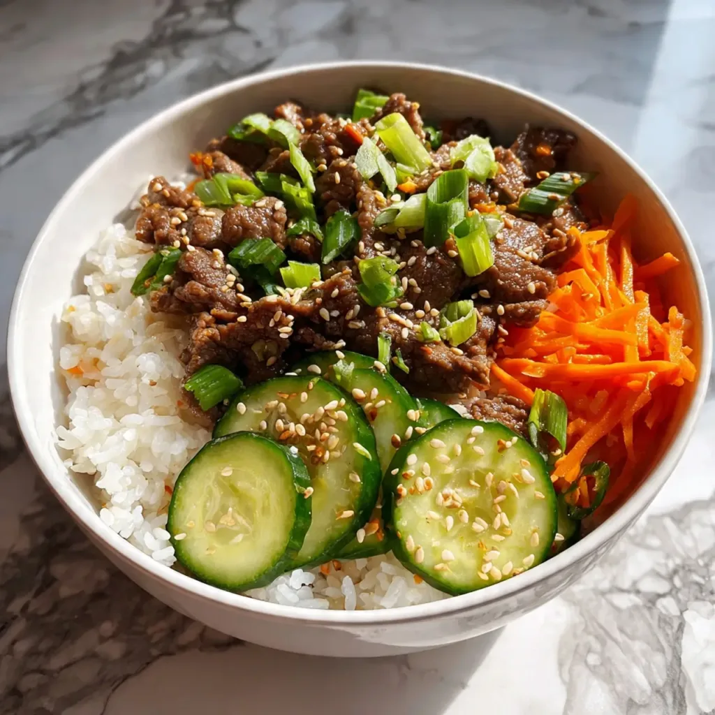 Scoop ½ cup cooked rice into each bowl, top with the saucy ground beef, then layer on cucumbers, shredded carrots, sesame seeds, and green onion greens.